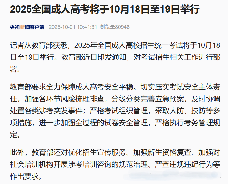 據央視新聞:記者從教育部獲悉,2025年全國成人高校招生統一考試將于10月18日至19日舉行。教育部近日印發通知,對考試招生相關工作進行部署。