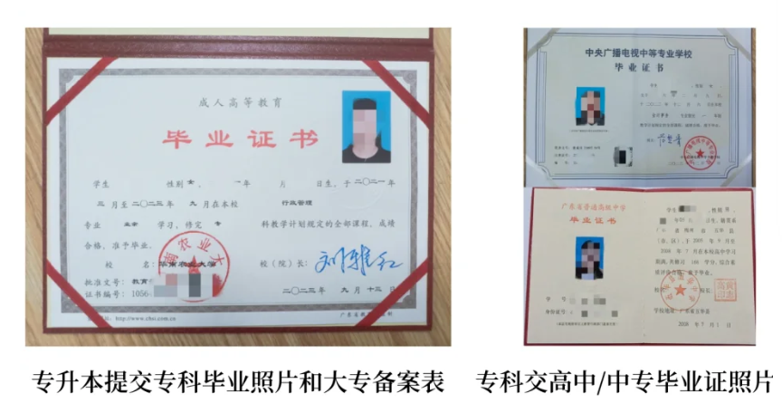 學歷證書:高中(或同等學歷)畢業證書原件及復印件,或大專(或以上)畢業證書原件及復印件(針對專升本考生)。