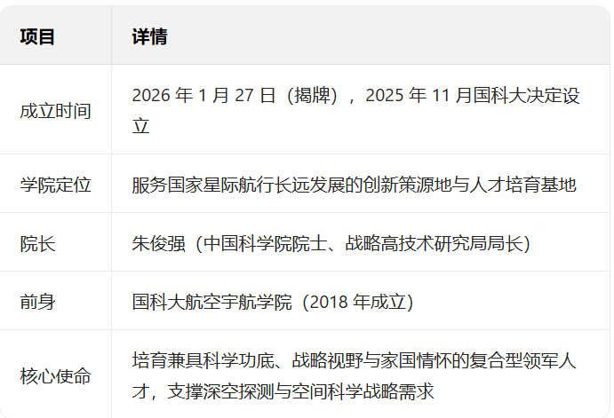 2026 年 1 月 27 日,中國科學院大學星際航行學院在北京揭牌成立,這是我國首個以 “星際航行” 命名的專業化特色學院,由中國科學院院士朱俊強擔任院長,旨在為國家深空探測戰略培育復合型領軍人才,破解航天高端人才瓶頸。以下從核心信息、設立背景、學科與培養體系、平臺與師資、戰略意義五個方面展開介紹: