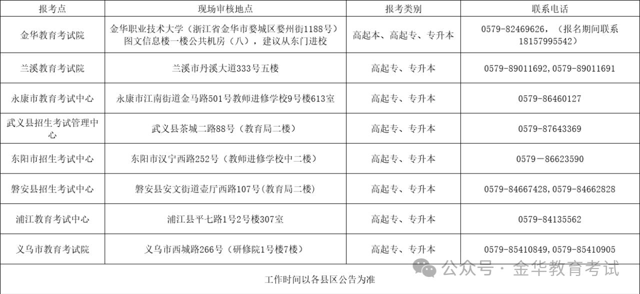 1. 金華市區及各縣(市)均設有成人高考報名點。其中,金華市區報名點接受以下類別報名:金華市區專升本、金華市區高起專及全市高起本;各縣(市)報名點僅接受專升本、高起專報名,不接受高起本報名。