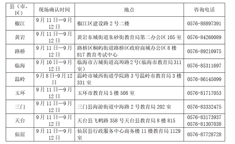 臺(tái)州市直高中起點(diǎn)升本科、專科起點(diǎn)升本科(特別提醒:臺(tái)州市直考點(diǎn)專科起點(diǎn)升本科只接收社保繳納在臺(tái)州市本級的考生,考生一般應(yīng)當(dāng)在戶口所在地或社保所在地報(bào)名并參加考試。)現(xiàn)場審核時(shí)間為:9月10日8:30-11:30,14:30-17:00;現(xiàn)場審核地點(diǎn):臺(tái)州市教育局一樓報(bào)名大廳(臺(tái)州市椒江區(qū)康平路188號);咨詢電話:88515763,88501927。各縣(市、區(qū))高中起點(diǎn)升專科和專科起點(diǎn)升本科考生現(xiàn)場信息審核確認(rèn)需到各縣(市、區(qū))考試中心辦理,詳情請咨詢當(dāng)?shù)乜荚囍行霓k公室(見附件)。