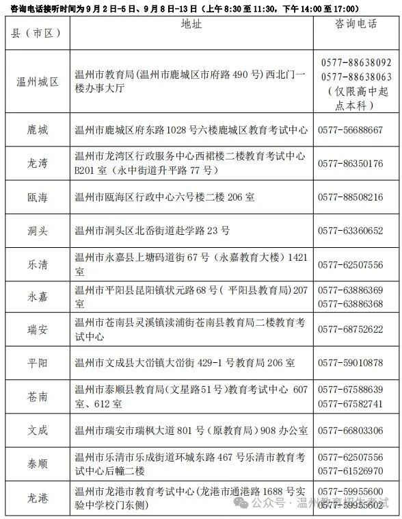 2025年溫州市成人高考各報名點地址及咨詢電話詳見文末圖片,溫州市各報名點現場審核時間如下: