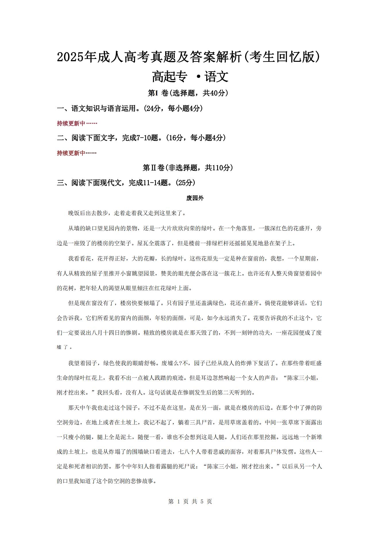 2025年成人高考高起專語文真題及解析(考生回憶版)