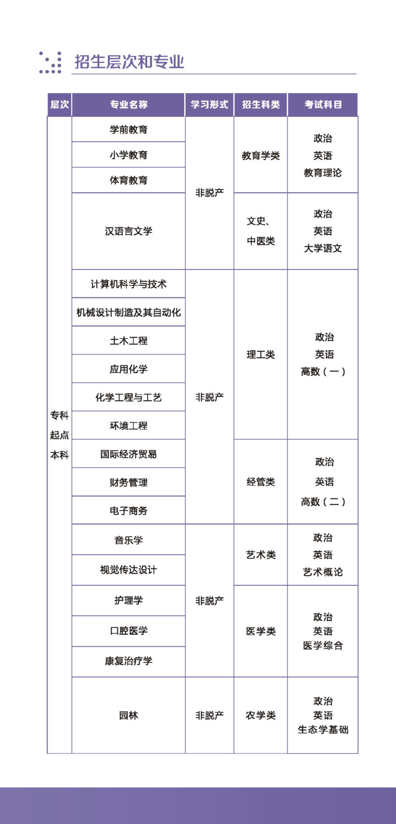 (三)醫學類。報考臨床醫學、口腔醫學、預防醫學、中醫學等臨床類專業的考生,需取得省級衛生健康行政部門頒發的相應類別的執業助理醫師及以上資格證書或取得國家認可的普通中專及以上相應專業學歷;或者縣級及以上衛生健康行政部門頒發的鄉村醫生執業證書并具有中專學歷或中專水平證書。報考護理學專業的考生應當取得衛生健康行政部門頒發的護士執業證書(護理學衛生專業技術資格、護士執業資格考試成績合格證明等均不能作為執業護士證書)。報考醫學門類其他專業(含中藥學類、藥學類)的考生應當是從事衛生、醫藥行業工作的在職專業技術人員。考生報考的專業原則上應與所從事的專業對口。