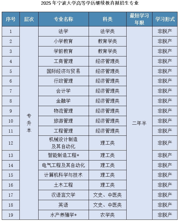 目前,寧波大學高等學歷繼續教育只招收專升本層次的學生。2025年擬招生專業見下表: